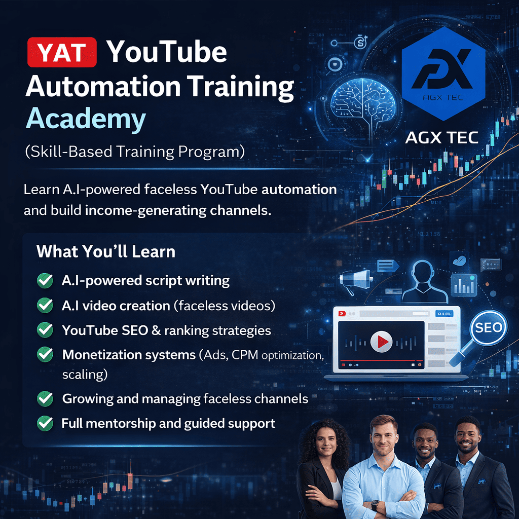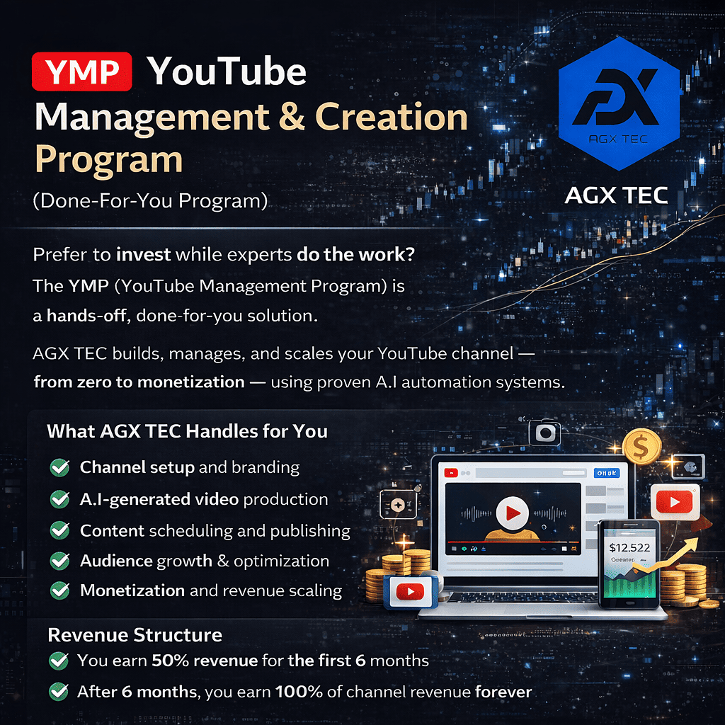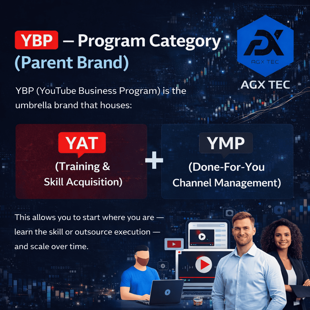 PDF Training Plan PDF Training PlanBuild Scalable Digital Income with A.I-Powered, Faceless YouTube Channels The A.I YouTube Business Program (YBP) is a structured digital income ecosystem designed by AGX TEC to help individuals profit from YouTube automation using advanced Artificial Intelligence tools. This program removes the traditional barriers to content creation — no face, no filming, no editing skills — while leveraging YouTube as a long-term, monthly-paying digital asset.